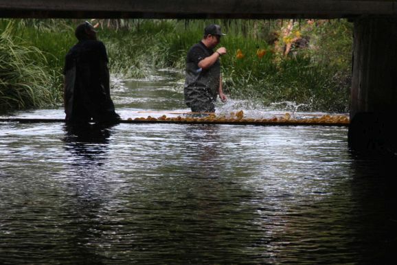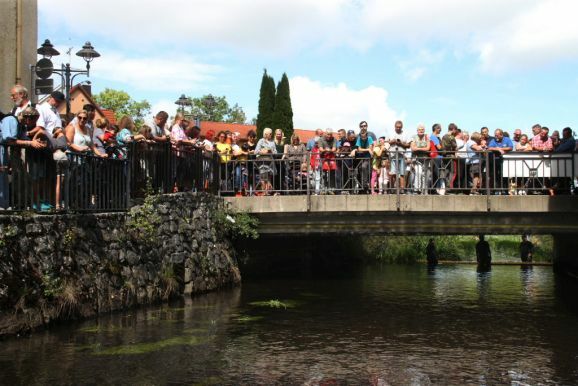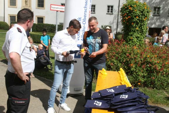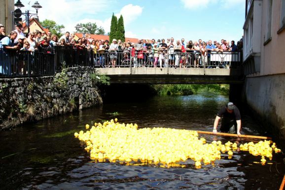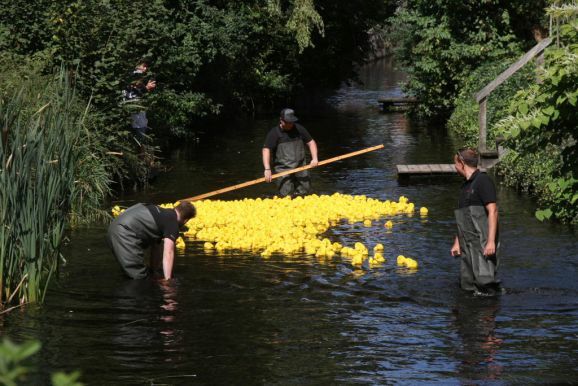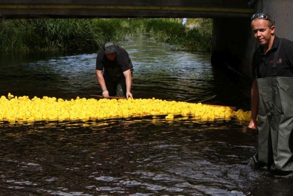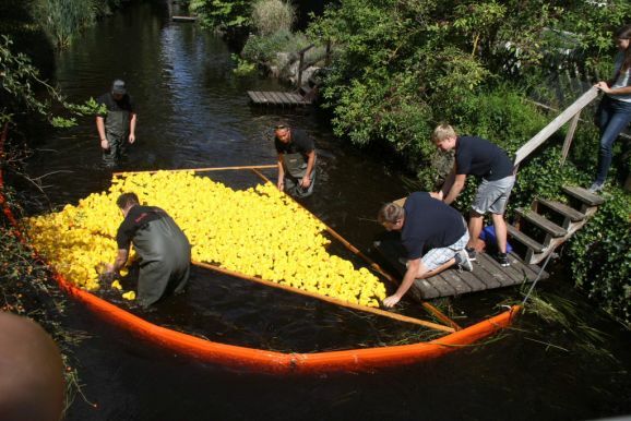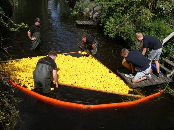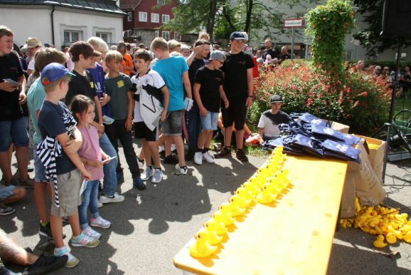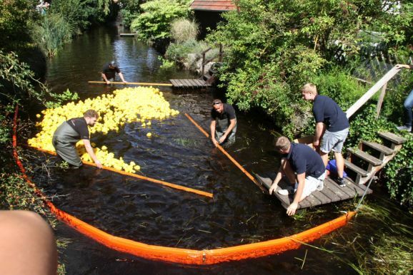 Bei der Siegerehrung im Schlosshof mit dem Geschäftsstellenleiter der VBAO, Markus Buhmann gab Schmehl auch bekannt, wofür die Jugendfeuerwehr die Geldspende verwenden wird: damit werden die Unkosten für die Teilnahme am Kreisjugendfeuerwehr-Zeltlager gedeckt werden. Doch ehe die große Menge an gelben Gummitieren „zu Wasser gelassen“ werden konnte, musste die „Rennstrecke“ zwischen Luxeuil-Brücke und der Brücke Espenweg erst einmal „schiffbar“ gemacht werden.
