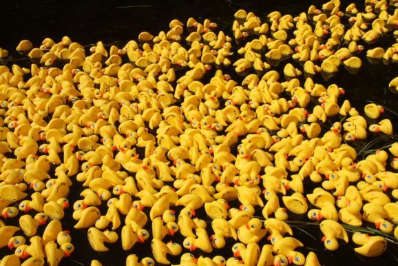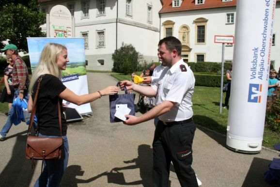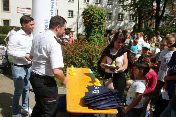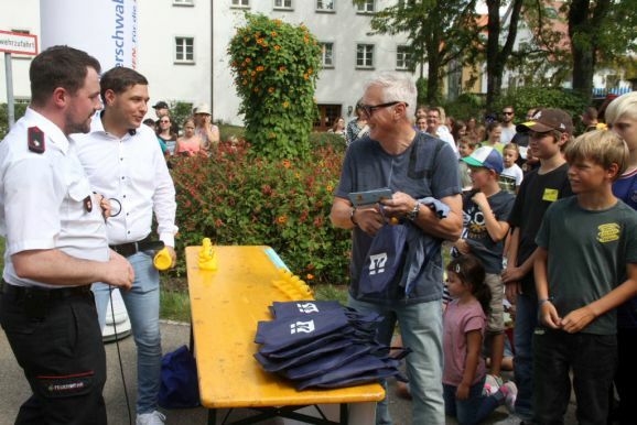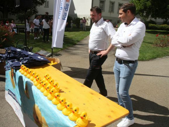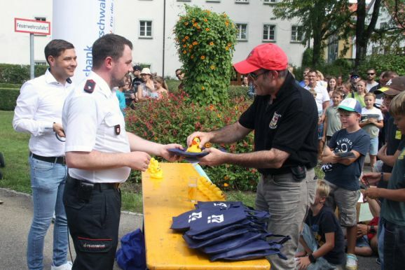 Mit dem Kauf einiger der von der Volksbank Allgäu-Oberschwaben gestifteten Quietsche-Enten konnte jedermann die Jugendfeuerwehr Bad Wurzach, die in diesem Jahr ihr 40jähriges Jubiläum feiert, unterstützen. Dies taten denn auch viele kleine und große Gönner – ein ganz spendabler Unternehmer brachte gleich 50 Stück an den Start bei der Luxeuil-Brücke – so dass sich Pascal Schmehl, der Leiter der Jugendfeuerwehr, über eine Riesenmenge von über 1.000 von seinen Jugendfeuerwehrler verkauften Quietschetiere freuen konnte.