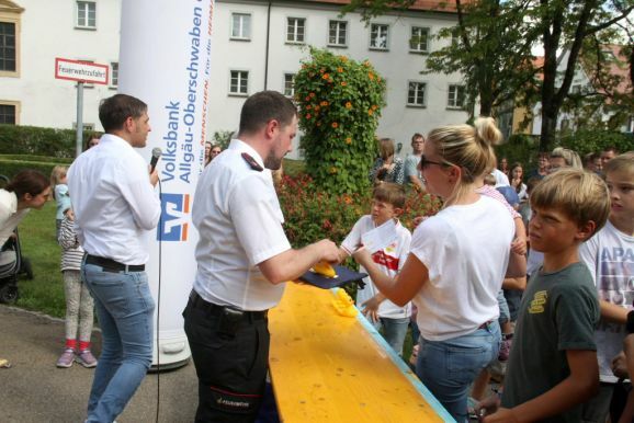 Was im Rahmen einer Feuerwehrübung am Donnerstagabend erledigt wurde, so dass beim „Rennende“ die 20 Gewinner der von der Volksbank Allgäu-Oberschwaben gestifteten Preise unter den Augen zahlreicher Zuschauer aus der Ach gefischt werden konnten.