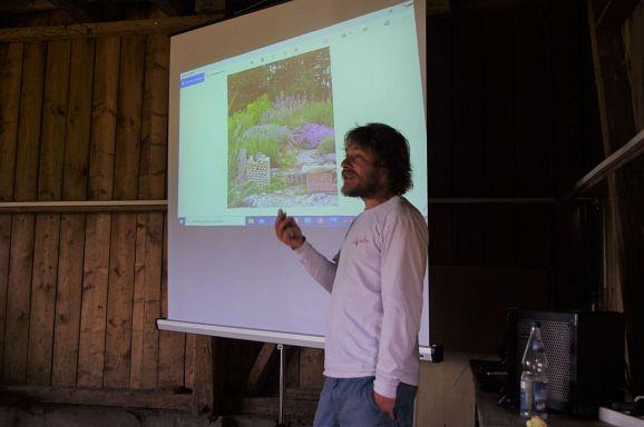 Wie man genau Hügelbeete baut, erklärte Schmitt erst am Ende seines Vortrags: Man nimmt organische Materialien , jüngeres und älteres Holz, groß und klein und arbeitet dort RAL-Kompost ein. Dann kann gesät werden, was immer man auch mag. Aber man braucht heimische Wildblumen und die Tierbewohner und Insekten dazu.