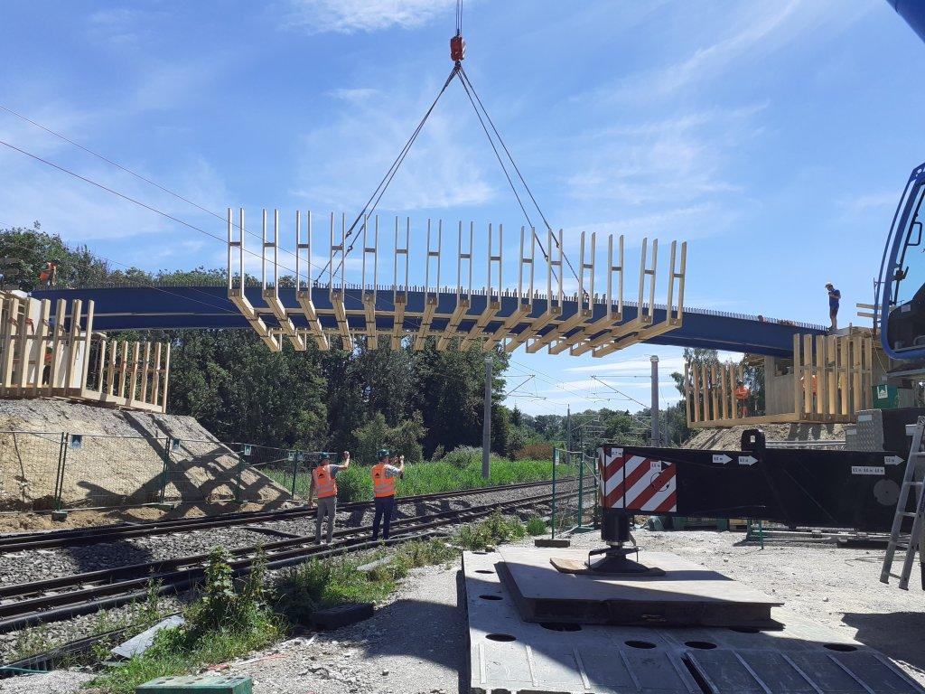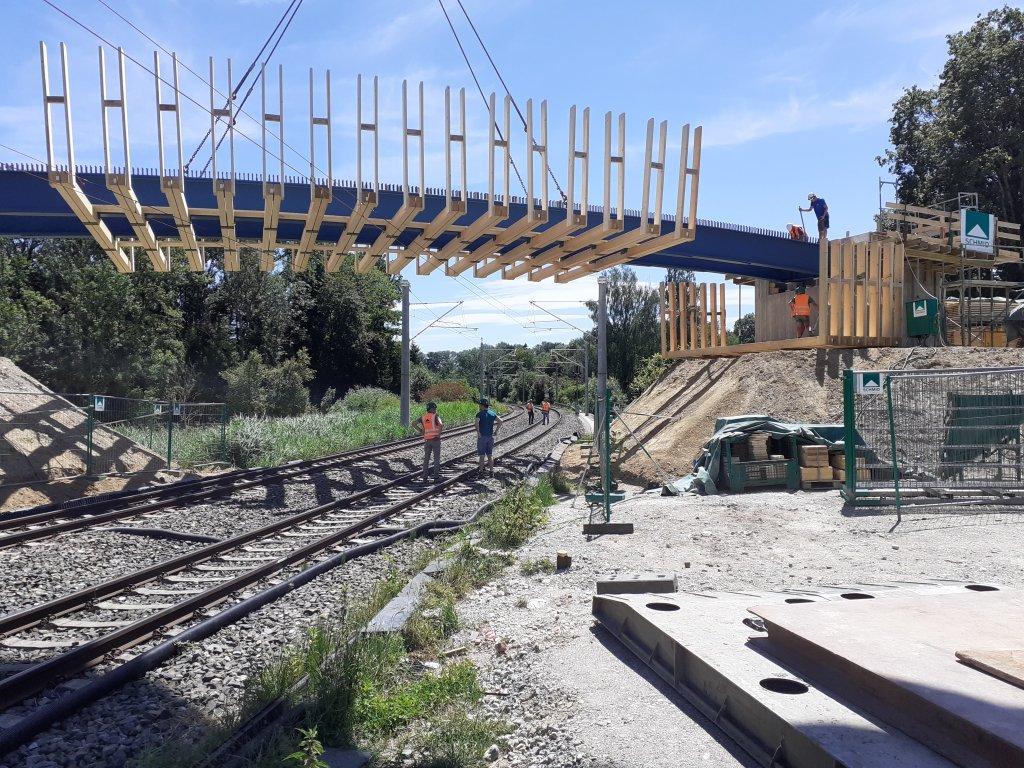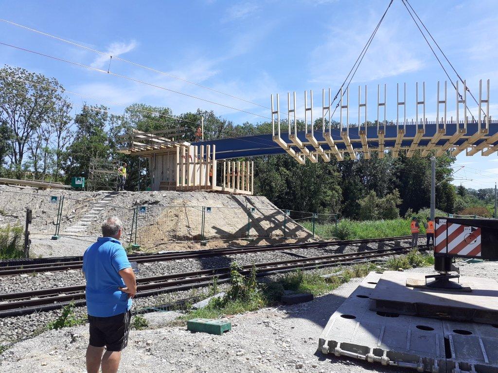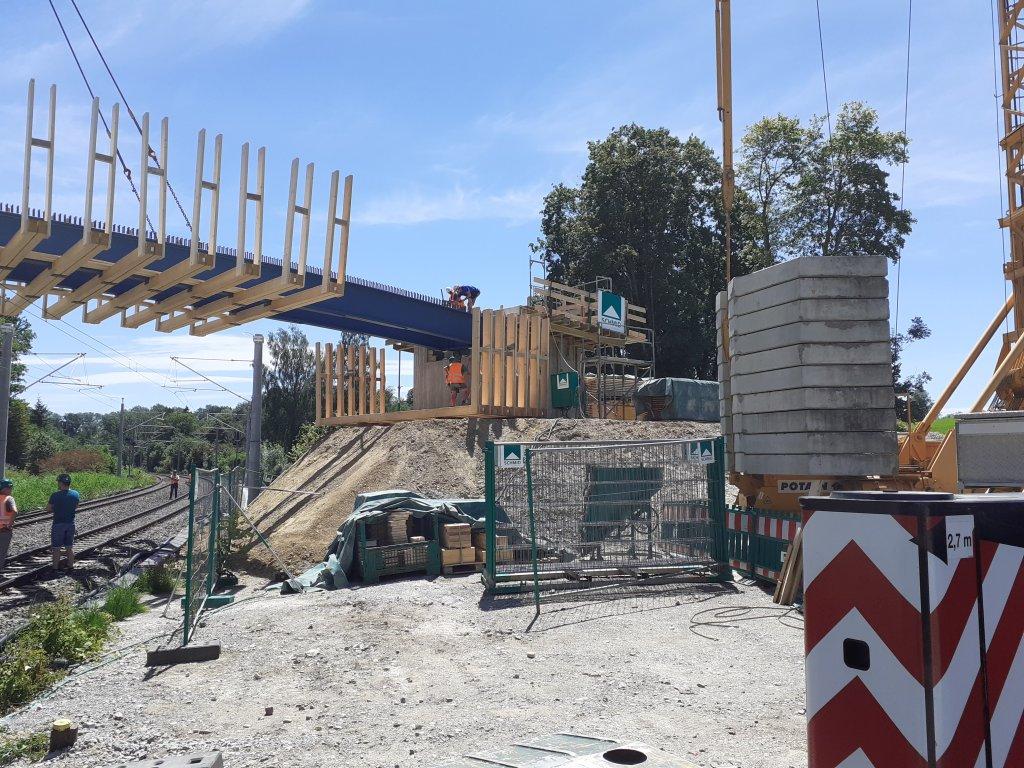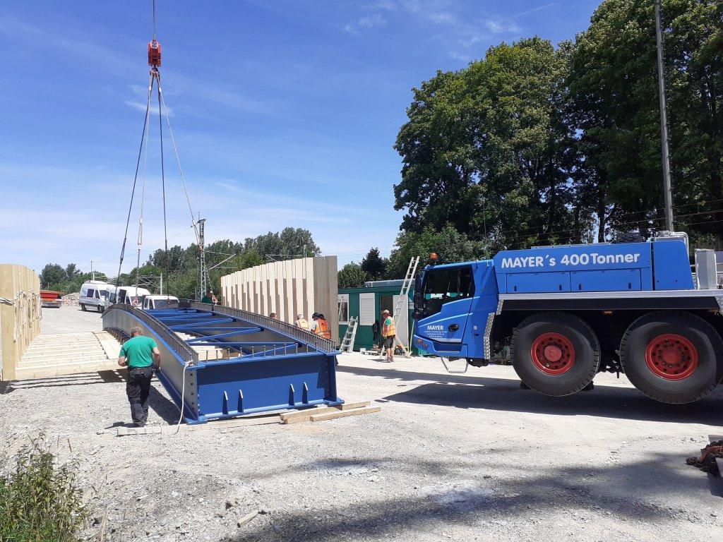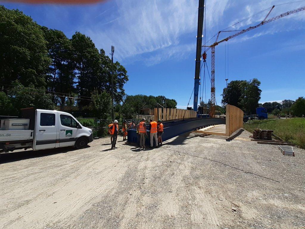 Jetzt wird die Brücke noch verkeilt, geschraubt und geschweißt, bevor sie zur Benutzung freigegeben werden kann. Bis zum 12.07. dauert dieser Teil des Auftrags.