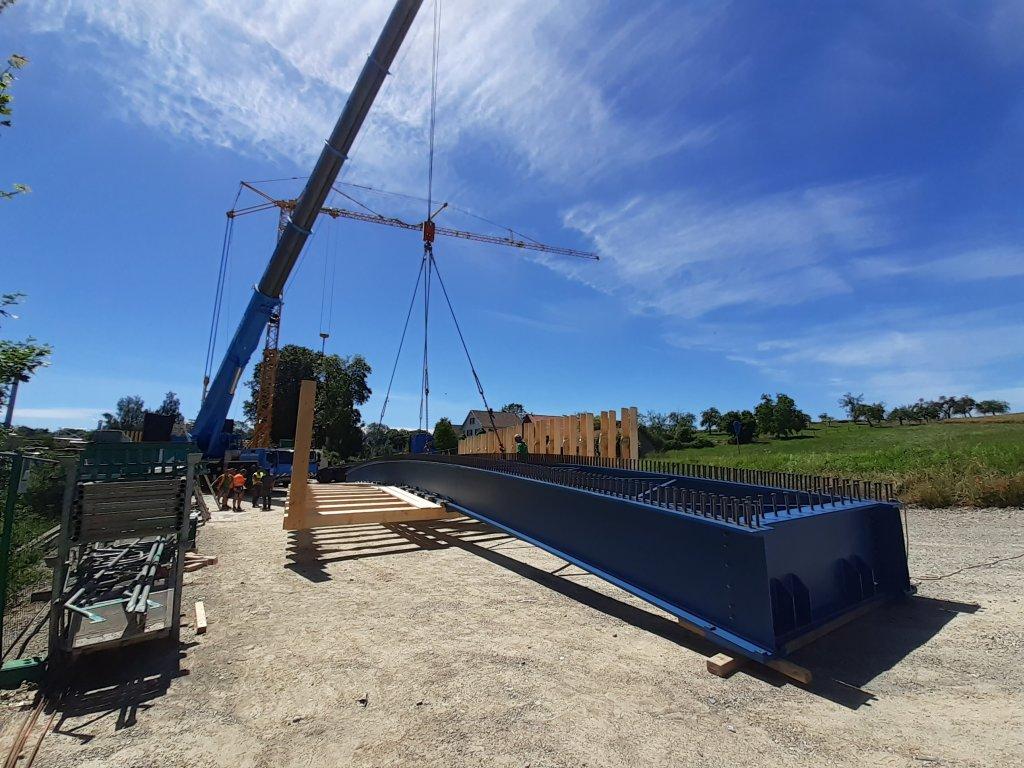 Aulendorf – Überrascht, wie schnell alles ging, ist der Zollenreuter Ortsvorsteher Stephan Wülfrath, der den entscheidenden 10 Minuten, während die 30 Tonnen schwere Brückenträger an Ort und Stelle platziert wurde, zugegen war. Auch der Bauherr Pfeifer Holding GmbH aus Memmingen ist zufrieden. Mit einem 400 t Autokran der Firma Mayer aus Burgberg wurde das Teil an die richtige Stelle gehievt.