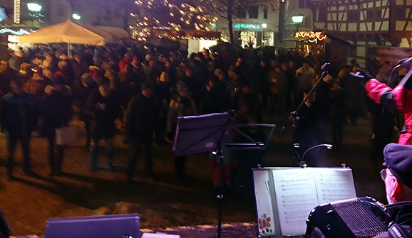 Wie schon in früheren Jahren bildete auch dieses Jahr der Auftritt der Aulendorfer an jenem Samstagabend den Abschluss des Tages. Trotz eisiger Kälte war zu Beginn um 20.00 Uhr der Marktplatz vor der Kirche immer noch gut besucht. Ein gutes Dutzend hellerleuchteter Marktbuden verbreitete eine festliche Atmosphäre – ungeachtet der eisigen Temperaturen.