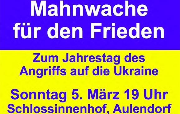 Aulendorf - Die Aulendorfer Friedensinitiative, der BUND mit Unterstützung von Mitgliedern aus der Katholischen und Evangelischen Kirchengemeinde in Aulendorf, lädt alle Bürgerinnen und Bürger zur Teilnahme an der Mahnwache für den Frieden am kommenden Sonntag, 5. März, um 19.00 Uhr im Schlossinnenhof in Aulendorf ein.