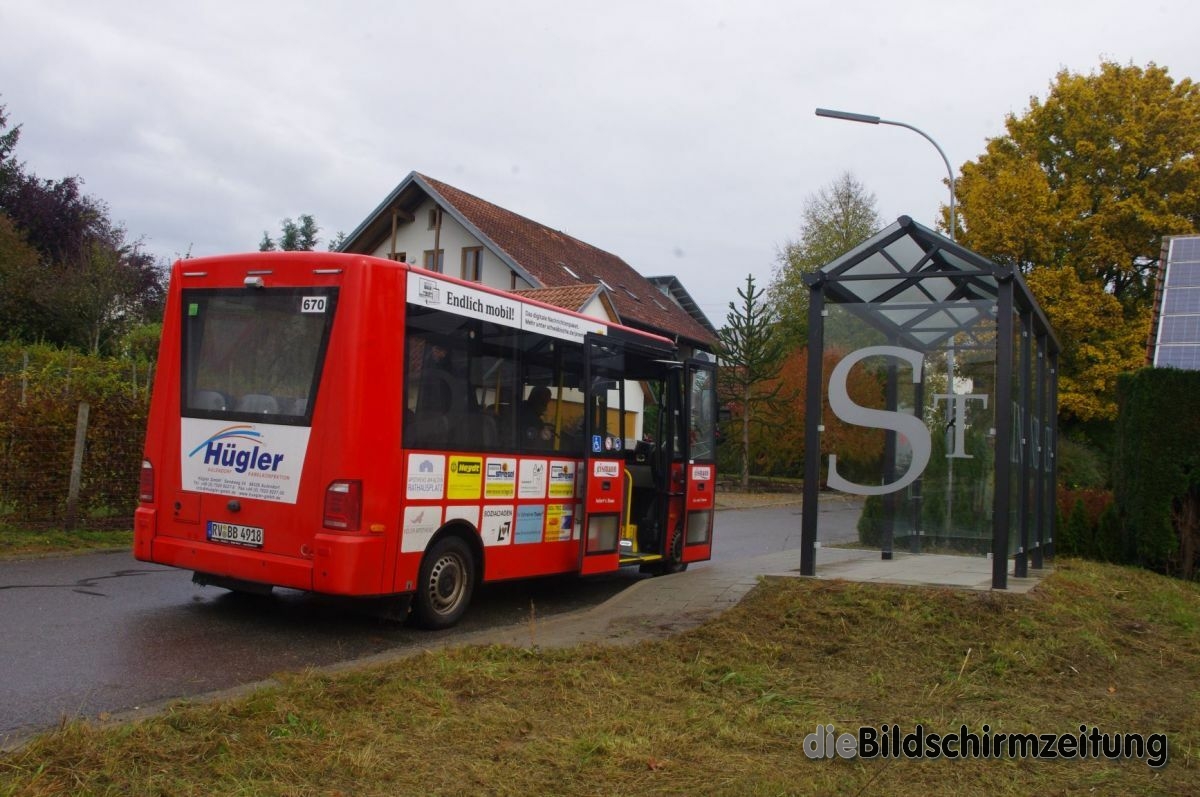 Jubiläumswünsche allerdings schon, denn zu runden, hohen Geburtstagen gibt es zukünftig einen Freifahrtschein mit dem Bürgerbus, ein Willkommensgeschenk. Mit einer Anzeige in der „Schwäbischen Zeitungsbeilage Aktiv“ wird dieses Angebot beworben werden und die Leser der „dieBildschirmzeitung.de“ wissen es nun auch. In Steinenbach gibt es eine neue überdachte Haltestelle zu sehen. Der Ort, so Holder, zähle tagsüber doppelt so viele Bewohner wie nachts, bedingt durch die Schüler des Studienkollegs St. Johann. Holder ist einer der Fahrer der ersten Stunde und interessiert sich auch als Ortsbürgermeister Blönried für seinen Fußballverein die SG Blönried-Eberbach, deren Sportplatz wir eben passieren. Als nächsten Teilort steuern wir Münchenreute an, am Proberaum des Musikvereins vorbei, der auch schon das Kreismusikfest nebenan in einem großen Festzelt ausgerichtet hat.