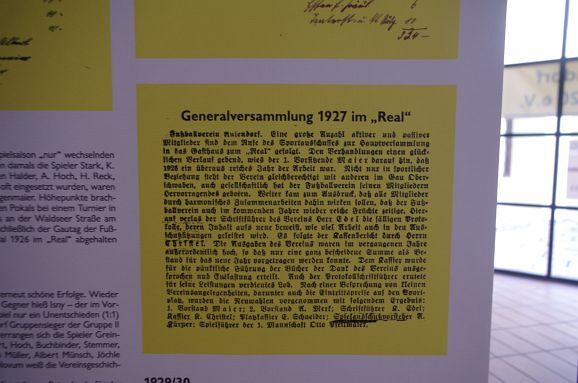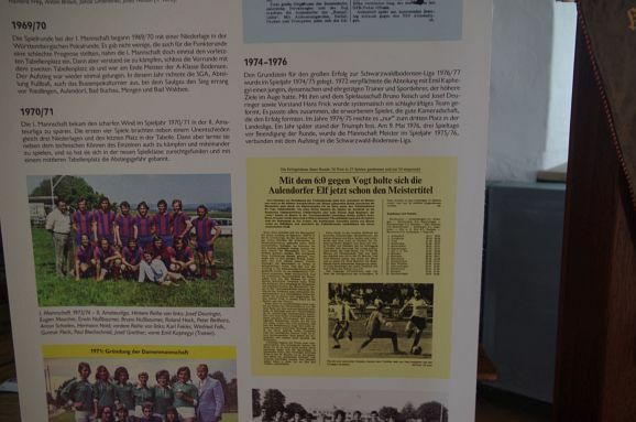 Vom Gründungsjahr 1920 bis heute sind viele Bilder, Fahnen, Dokumente. im Aulendorfer Schloss ausgestellt. Außerdem kann man am Empfang die Broschüre „100 Jahre Fußball in Aulendorf“ erwerben.
