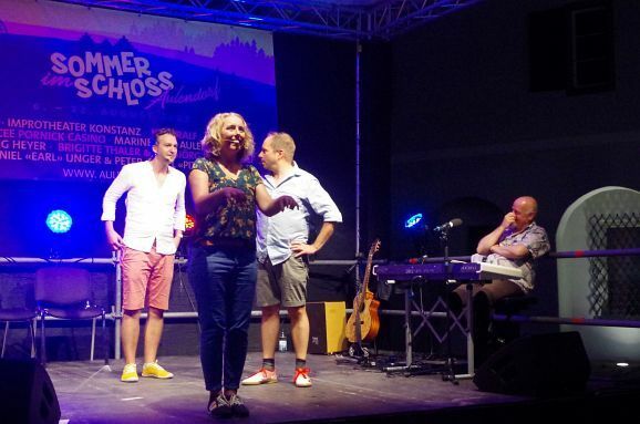 Also begann das Improtheater Konstanz pünktlich um 19.30 Uhr mit Uwe Rodi, dem Mann am Klavier.. Bekannt in Aulendorf ist die Vierertruppe durch einen Auftritt im Dorfgemeinschaftshaus Tannhausaen und es sind Britta Lutz, Jens Weber und Till Maurer, die auf der Bühne agieren mit musikalischer Begleitung von Rodi. „Wir wissen, dass wir uns nichts merken können“, erklären sie ihr Spiel.