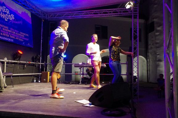 „Häggela“ ist das Stichwort der nächsten halben Stunde im Sommertheater. Jetzt macht sogar die Kirchenglocke mit und gibt Einsätze vor. Im letzten Drittel, es ist schon dunkel geworden und es hat sich ausgehäggelt. Wir sind im musikalischen Set angekommen.