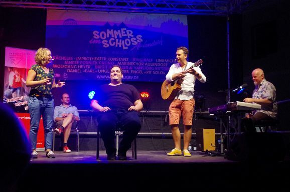 „Aulendorf, seid ihr alle da, heißt die Aufforderung Das Kreuzfahrtschiff mit Sascha Hehn und Kapitän wird gespielt und gesungen. Die Beschwerdestelle für offene Schnürsenkel ist ein weiteres Nonsensthema und auch das letzte des Abends. Genug geblödelt.