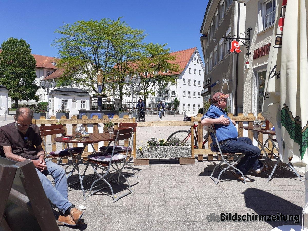 Durch Bad Waldsee am beliebten Stadtsee mit seinem ein Kilometer langen Rundweg vorbei, führt die Route nach Hittisweiler über den Berg nach Haidgau und danach die die Landstraße überquerend sind es nur noch fünf Kilometer bis Bad Wurzach zu fahren. An einem vom Verkehr wenig frequentierten Pfingstmontag ist das selbst über Landstraßen kein Problem. Eher ein Problem war es eine passende Raststätte in Bad Wurzach zu finden. Am Eisverkauf gegenüber dem Reisebüro WWeiss war die Schlange zu lang, so hielt ich am Biergarten beim Stadtbrunnen mit Blick auf das Schloss.