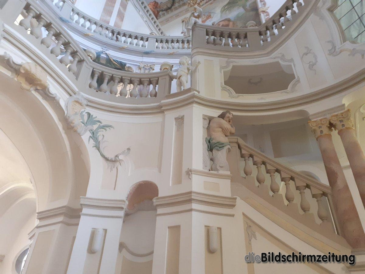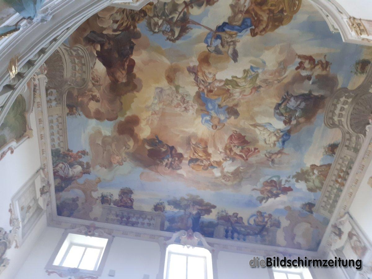 Das Schloss ist inzwischen von einem Seniorenheim und dem Salvatorkolleg bewohnt, dazwischen die über Oberschwaben hinaus bekannte Barocktreppe, die man tagsüber jederzeit besichtigen kann. Eines der schönsten Treppenhäuser Süddeutschlands, wird dieses gepriesen und es zeigt ein Barocktreppenhaus mit elegant geschwungener beidseitiger Treppe. Das Deckenfresko von 1728 gilt als einer der Höhepunkte der Oberschwäbischen Barockstraße. Besucher, wie jene aus dem Sauerland, die ich dort traf, staunen, wenn ihr Blick im lichterfüllten Treppenhaus von den barocken Stuckarbeiten und den farbenprächtigen Gemälden an Wänden und Decke schweift. Im Mittelpunkt der Darstellung steht der olympische Götterhimmel mit der Herkules-Sage.