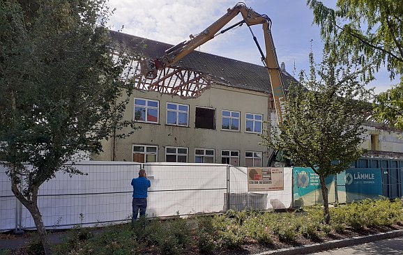 Aulendorf – Wie vom Gemeinderat beschlossen, wird ein Teil der Grundschule in den Sommerferien abgerissen. Nach der Entkernung des Gebäudes, geht es nun an das Dach und die Wände, die dem Boden gleich gemacht werden.