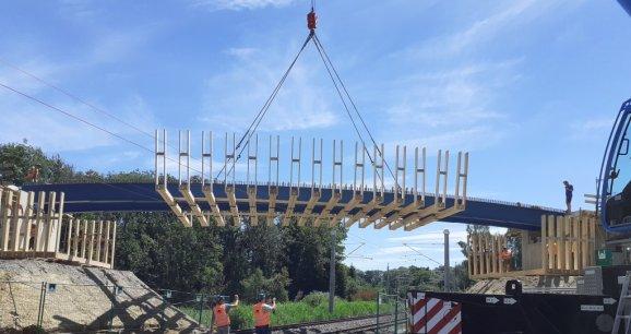 Aulendorf – Überrascht, wie schnell alles ging, ist der Zollenreuter Ortsvorsteher Stephan Wülfrath, der den entscheidenden 10 Minuten, während die 30 Tonnen schwere Brückenträger an Ort und Stelle platziert wurde, zugegen war. Auch der Bauherr Pfeifer Holding GmbH aus Memmingen ist zufrieden. Mit einem 400 t Autokran der Firma Mayer aus Burgberg wurde das Teil an die richtige Stelle gehievt.