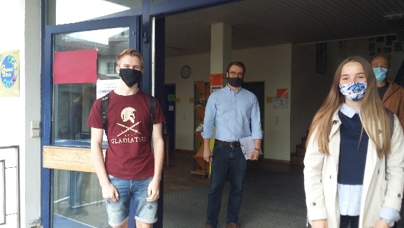 Blönried - Am Montagmorgen des 04.05. öffneten sich nach wochenlanger Schulschließung auch am Blönrieder Gymnasium die Türen wieder für die Klassen 11 und 12. Dabei hat sich die Schulleitung viel einfallen lassen, um die Gesundheit der SchülerInnen, LehrerInnen und MitarbeiterInnen möglichst gut zu schützen: mit Masken, Abstandsmarkierungen, geteilten Kursräumen, gestaffelten Pausen, Desinfektionsmittel, Seife und Einwegtüchern sowie getrennten Eingängen für die Klassenstufen.