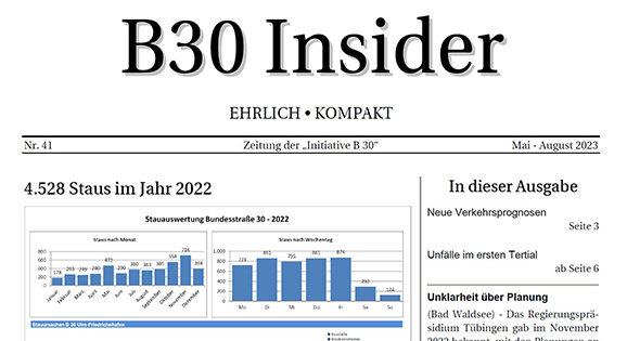 Region - Die „Initiative B30“ informiert dreimal jährlich mit der digital verbreiteten Zeitung „B30 Insider“ über aktuelle Entwicklungen rund um die Bundesstraße 30. Die Ausgabe Mai - August 2023 steht ab sofort zum kostenlosen Download bereit.
