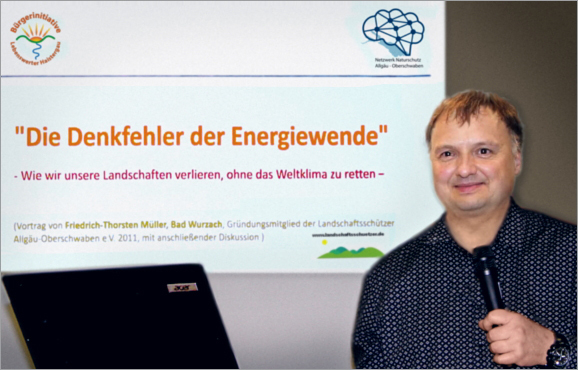 Unterschwarzach - Am 28. April (referierte im Gasthof „Hirsch“ in Unterschwarzach Friedrich-Thorsten Müller, Ökonom und Gründungsmitglied der Bad Wurzacher Landschaftschützer, vor fast 60 Gästen über die (Denk-)Fehler der aktuellen Energiepolitik. Als Referent der Veranstaltung des „Netzwerks Naturschutz Allgäu-Oberschwaben“ befasste er sich vor allem mit den Grundannahmen der Energiewendepolitik sowie mit der Frage nach deren finanziellen und technischen Umsetzbarkeit. Hier der Bericht von Seiten der Veranstalter: