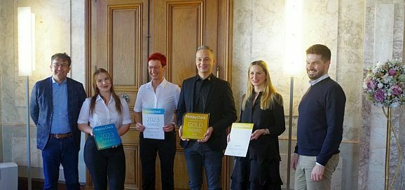 Aulendorf – Im Marmorsaal des Aulendorfer Schlosses erhielten Oliver Spähn mit Tochter Jessica vom Hotel Arthus und Helga Harsch mit Tochter Karolina vom Hofgut Tiergarten die Holiday Check Special Award Urkunden 2023 überreicht.