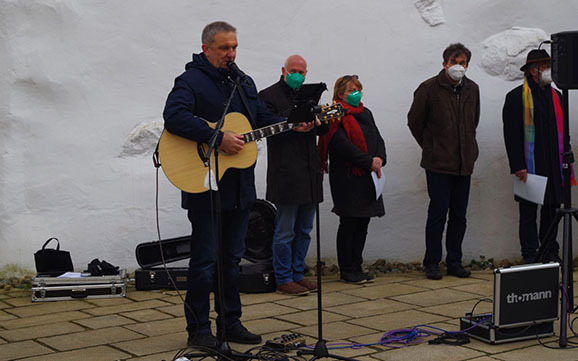 Aulendorf - Am 3. April kamen etwa 100 Personen im Schlossinnenhof zusammen, um Solidarität mit der Ukraine zu bekunden und für den Frieden einzustehen.