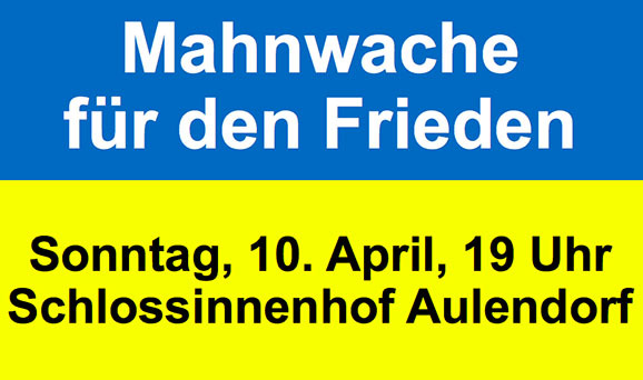 Aulendorf - Die Serie der Mahnwachen für den Frieden in Aulendorf findet am kommenden Sonntag, 10. April, ihre Fortsetzung. Wie immer beginnt die Kundgebung im Schlossinnenhof um 19.00 Uhr.