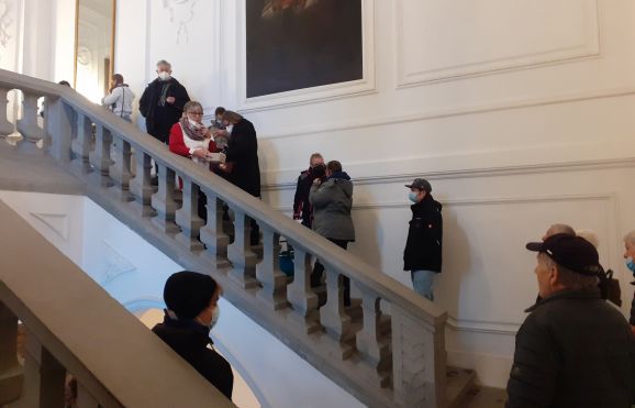 Aulendorf – Bereits eine halbe Stunde vor dem Impfbeginn um 9 Uhr hatte sich eine Schlange von Impflingen im Treppenhaus zum Marmorsaal gebildet. Die Hauptamtsleiterin Brigitte Thoma verteilte Nummern in der Reihenfolge des Eintreffens. Ich erhielt die Nummer 25. Nach dem Ausfüllen einer Einwilligungserklärung und eines Anamnesebogens ging es etwa eine Stunde später weiter zur Impfung.
