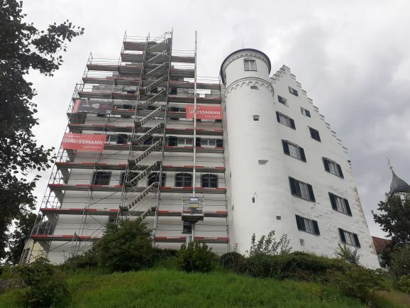 Aulendorf – Mit der Einrüstung der Südostfassade geht die Renovierung beim Aulendorfer Schloss in die Endphase. Somit erscheint das Wahrzeichen der Stadt bald in neuem Glanz weit sichtbar über das Schussental hinweg. Bericht und Bild: Gerhard Maucher