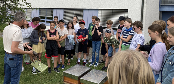 Aulendorf - An vier aufeinanderfolgenden Tagen besuchten Kinder der Klassen 5a/b/c/d der Schule am Schlosspark Aulendorf den „Bienendoktor“ Dr. Frank Neumann vom tierärztlichen Institut in Aulendorf und durften über ihn ihr Bienenwissen schärfen und erweitern. Zwei Bienenvölker wurden dabei beobachtet.