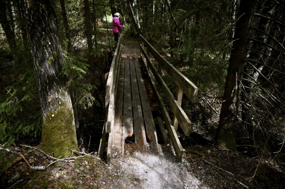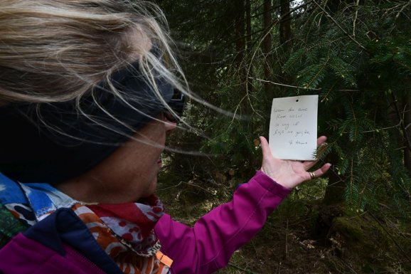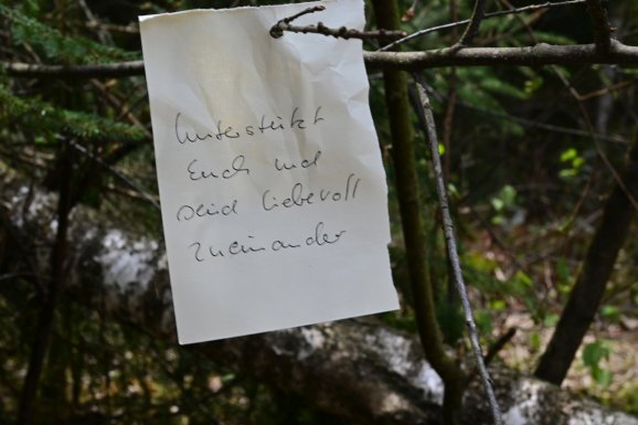 Noch ein paar Schritte über die Wiese. Rechts ab, über die kleine Brücke, auf den Waldpfad. Doch halt, da hängt ein Zettel. Ich hätte ihn ja übersehen, aber meine Frau hat den Blick für das Besondere. In feiner Schreibschrift steht ein Mutmacher Spruch. Und nach ein paar Schritten schon der nächste. Da hat sich jemand wirklich viel Mühe gemacht, und alle paar Dutzend Meter einen Sinnspruch-Zettel aufgehängt.