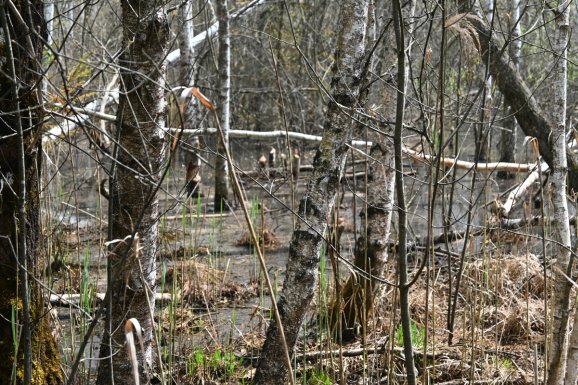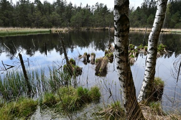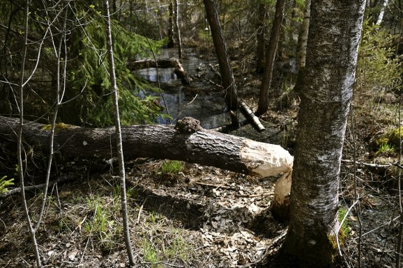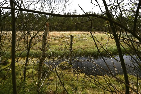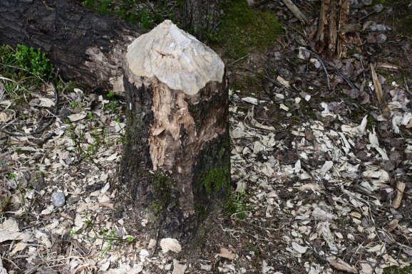 Im Wald ist vom Wind nichts mehr zu spüren. Die Sonne scheint kräftig. Der Reißverschluss an der Jacke wird flugs nach unten gezogen. Der weiche, federnde Waldboden: ein Balsam für Knie, Hüfte, Rücken. Rechts und links des Weges staut sich Wasser. Da war doch nur ein kleiner Bach, wo kommt das ganze Wasser her? Statt Rothaus-Weg könnte man den Pfad in Biberweg umbenennen. Überall haben die Nager ihre Spuren hinterlassen. Dicke und dünne Stämme sauber umgenagt. Geschält, gegessen. Und eine neue Wasserlandschaft geschaffen. Wenn die so weitermachen, kann man in 10.000 Jahren wieder Moor abbauen. Falls es dann noch jemanden gibt, der es gebrauchen kann. Vielleicht wieder zum Feuern?