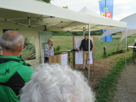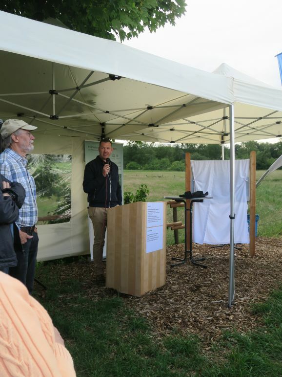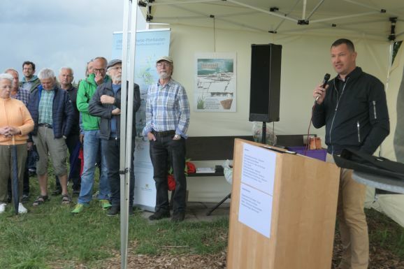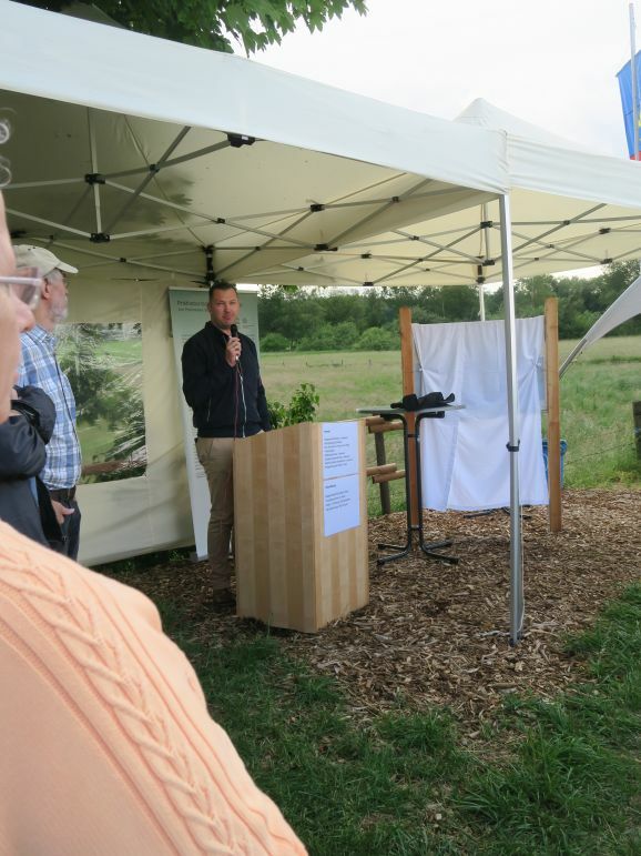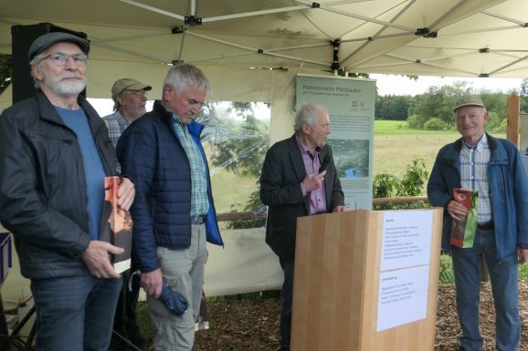 Konstantin Eisele als Vorsitzender der „Solidarischen Gemeinde“ verriet bei der Begrüßung, dass der Arbeitskreis „Heimatpflege“ zwar die Dokumentation des Moordorfs lieber im denkmalgeschützten leerstehenden Reutener Pfarrhaus gesehen hätte, mit diesem Standort unter freiem Himmel aber doch direkt vor Ort ein würdiger Platz gefunden wurde. „Zu den 30 Ruhebänken in unserer Ortschaft hat Franz Lämmle hier eine weitere Bank mit Blick auf das Moordorf wie auch auf die ‚Gute Beth‘ mit Kirche und Kloster errichtet“, bekundete Eisele dankbar.
