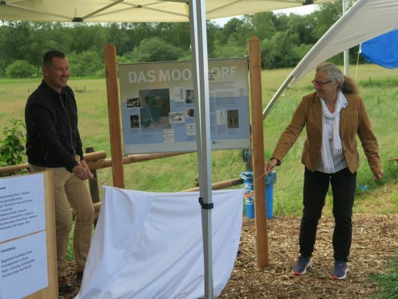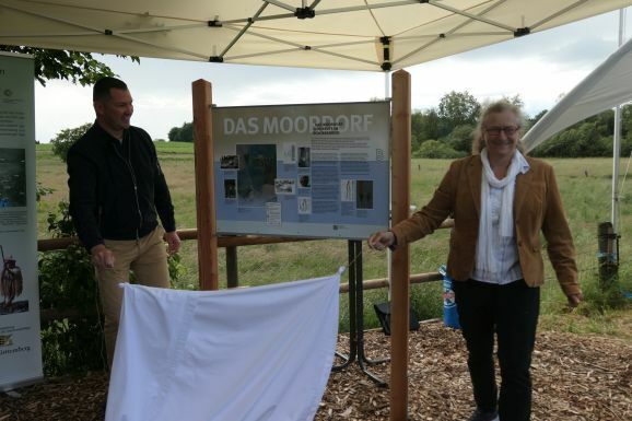 Werner Stadelmaier als Vorsitzender der Arbeitsgruppe „Moordorf“ sah mit diesen Tafeln einen guten Anfang gemacht: „Weiter haben wir aber noch weitere Ideen, z. B. einen Spielplatz zu bauen. Ein Stück dafür ist schon aufgebaut, der der Schleife nachempfundene Gabelbaum ein paar Meter weiter. Auch ein Stangengerüst können wir uns vorstellen, welches ein steinzeitliches Haus erahnen lassen kann.“