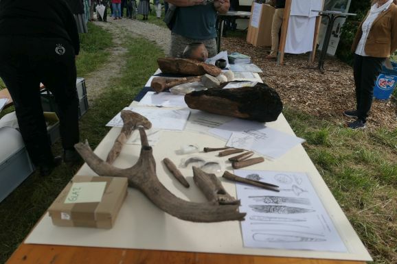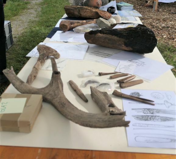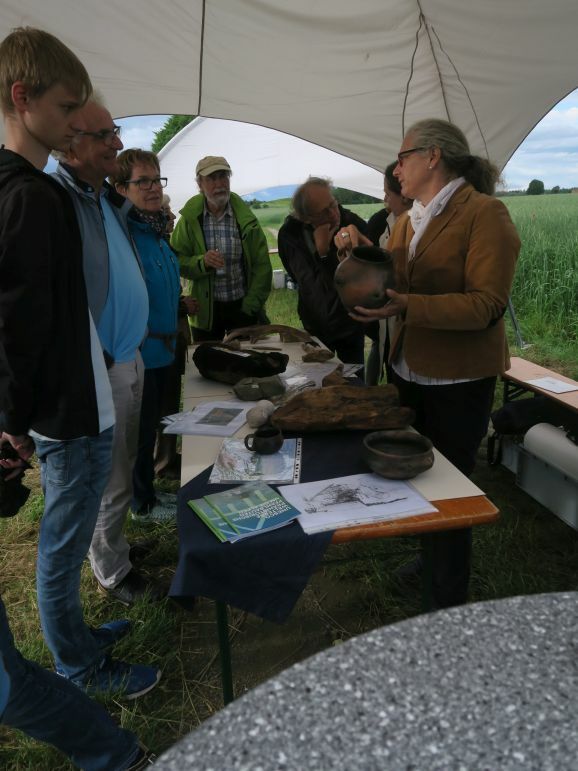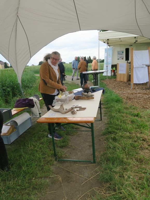 Um Steinzeit anschaulich werden zu lassen, brachten die Archäologinnen Frau Ebersbach und Frau Kalkowski einiges an Funden mit, die auf einem Tisch präsentiert und erläutert wurden, so auch Keramikgefäße als Repliken und als besondere Kostbarkeit ein Stück textiles Gewebe.