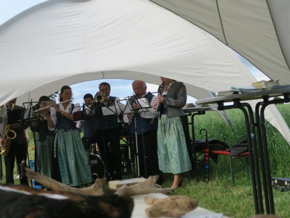 Nach dem einstündigen Festakt, bei welchem sich schwarze Gewitterwolken am Himmel immer wieder verzogen, gab es viele gute Gespräche bei Sekt, Saft und leckeren Broten. Eine Abordnung der Musikkapelle Reute-Gaisbeuren umrahmte musikalisch den festlichen Akt.
