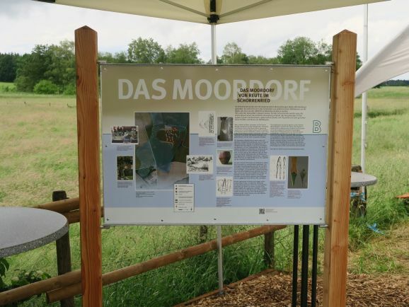 Reute - Grabungsort im Schorrenried in Reute informativ gekennzeichnet. Am Dienstagnachmittag wurden zwei Schautafeln über das steinzeitliche Moordorf im Rahmen eines kleinen Festaktes der Öffentlichkeit vorgestellt. Damit hatten mehrjährige Bemühungen der „Arbeitsgruppe Moordorf Reute“ im „Arbeitskreis Heimatpflege“ der „Solidarischen Gemeinde Reute-Gaisbeuren“ Erfolg.