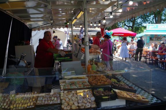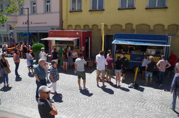 Bis 1 Uhr nachts gibt es Angebote vom Streetfood-Markt. Pakora-Teller und Chickenspieße sind schon aus, aber Cicken- und Lammcurry ist noch im Angebot. An anderen Ständen wird Eistorte, Zuckerwatte, Longdrinks und Crèpes, Spiralkartoffeln und Chips am Spieß verkauft. Italienisches Porchetta (Spanferkel) und Wagyu Burger stehen in Konkurrenz der Gaumenfreude zu echt schwäbischen Kässpätzle. Morgen noch ein Tag Bürgerfest und Ende dieses Monats folgt schon das traditionelle Altstadt – und Seenachtsfest.
