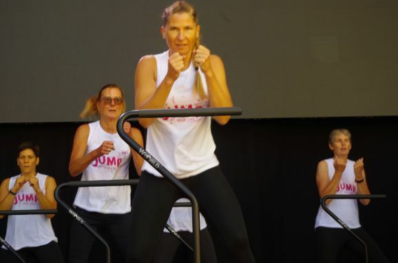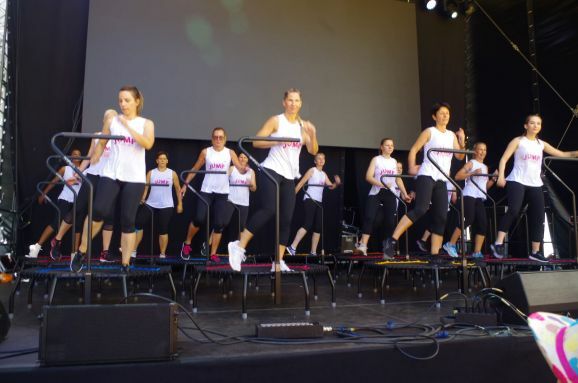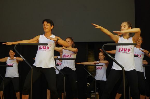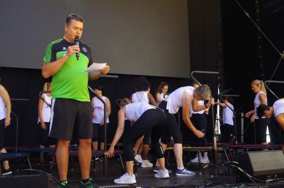 Der Vorstand des TG Bad Waldsee Christoph Rauhut erklärt den nächsten Programmpunkt. World Jumping auf dem Trampolin ist ein effektives Training für Bauch, Beine, Po und Rücken, sorgt für Beweglichkeit und verbessert die Koordination. Flotte Rhythmen und spezielle World Jumping-Highspeed-Trampoline sorgen dafür, dass bei den Übungen Herz und Kreislauf ordentlich in Schwung kommen und mehr Fett verbrennen als beim Joggen. Mitmachen kann jede/r ab 14 Jahre, egal mit welcher Fitness zu Beginn.