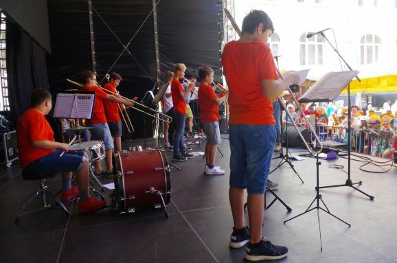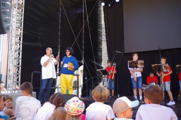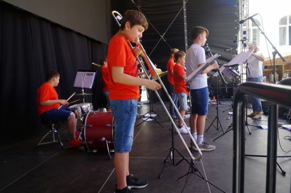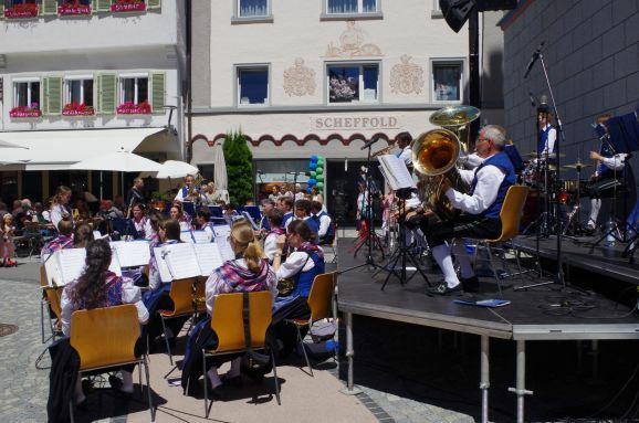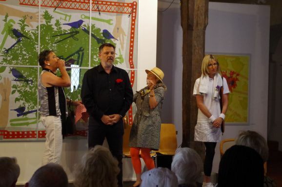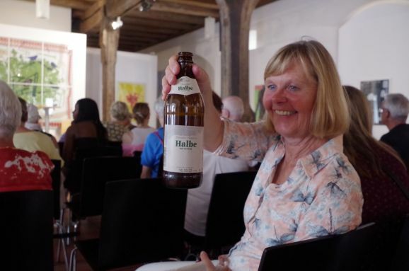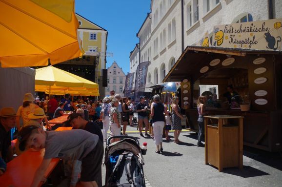 Die Frauen dieser Vorführung werden mit rhythmischem Klatschen angefeuert und mit tosendem Applaus verabschiedet. Karla Kolumna, der rasende Reporter in gelber Hose, blauer Pulli und schwarzer Perücke gekleidet, ist noch auf der Suche nach Eindrücken und Lebensweisheiten zum Bürgerfest für sein Freundebuch. Der Oberbürgermeister Matthias Henne hat schon den prominenten Anfang gemacht, aber es sind noch einige Seiten zu füllen. Walter Störk steht mit seiner Frau auch ganz vorne an der Bühne, als die Bläserklasse der Realschule auftritt. Sein Enkel Paul ist mit der Zugposaune dabei und dirigiert wird das jugendliche Ensemble von Claudia Bösch. Auch das Museum im Kornhaus ist geöffnet, das derzeit noch bis 7. August die Arbeiten des Malers Jörg Eberhard ausstellt. Jetzt wird jedoch Theater „Bier für Frauen“ aufgeführt. Frauen schreibt Ingo G. in einem Leserbrief an die Süddeutsche Zeitung sollten keinen Alkohol trinken.