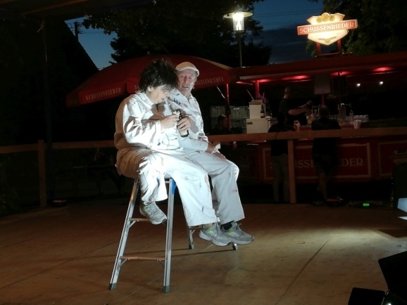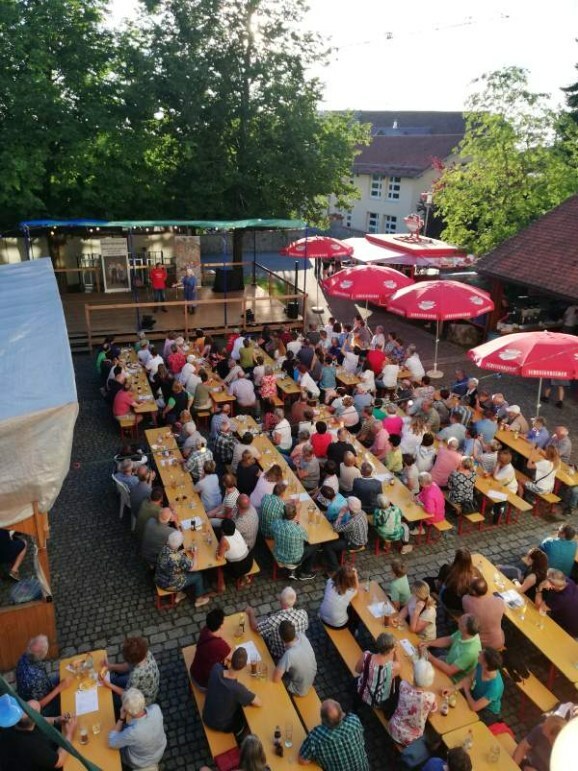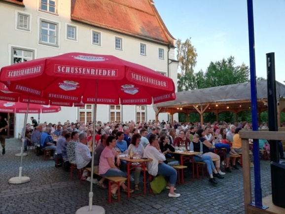 Ein Großteil der Plätze im schönen Burghof waren dann auch schnell besetzt, die Bedienungen hatten viel zu tun und der Andrang an der Essensausgabe nahm fast kein Ende. Kurz nach 20 Uhr kamen, nach einer kurzen Begrüßung durch Vereinsvorstand Johannes Hepp, die beiden Künstler dann endlich auf die Bühne.