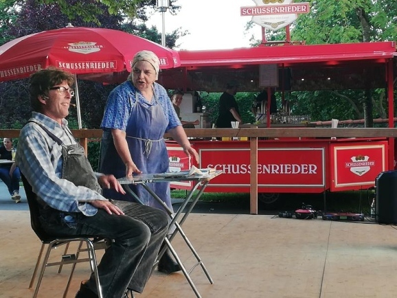 In ihren Paraderollen als Maddeis und Lena Schuhdone begeisterten die beiden Künstler Franz Auber und Hillu Stoll wieder das Publikum. Maddeis Schuhdone puschte sich im Vorfeld mit Hilfe des Publikums auf um seiner Lena endlich mal zu sagen wer der Herr im Hause sei. Als seine „Liebste“ dann aber auf die Bühne kam, war dieses Vorhaben dann schnell wieder vergessen und die Lachmuskeln wurden sehr strapaziert als Maddeis dann ziemlich schnell stotternd seiner Lena kleinbeigab.