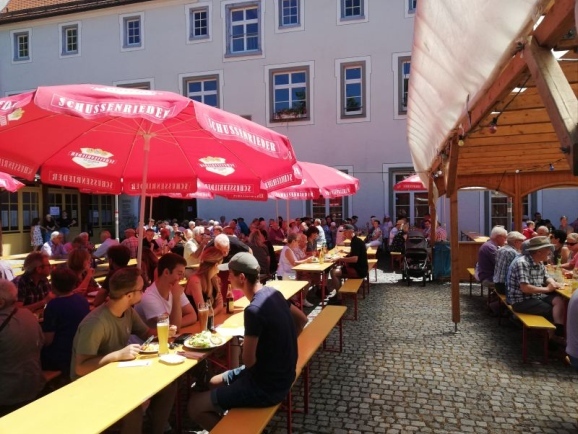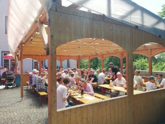 Michelwinnaden - Der Familiensonntag beim diesjährigen Burggrabenfest begann mit einem Frühschoppen mit der Kapelle „Polkakaiser“. Nachdem es schnell wärmer wurde im Burghof waren dann auch schnell die Plätze unter den schattenspendenden Bäumen belegt.