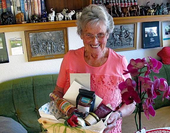Auch über den Besuch von Seiten der Stadt Bad Waldsee und das Geburtstagspräsent in Form eines Geschenkkorbes hat sich Ingeborg Schunger sichtlich gefreut. Die Stadt wünscht ihr viele weitere erfüllende Jahre und dankt für ihr ehrenamtliches Engagement im Spital.