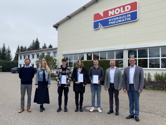 Die feierliche Übergabe fand bei der Fa. NOLD in Enzisreute statt und wurde durch eine Führung über das Betriebsgelände abgerundet. Ruwen Geray, Tino Jasper und Lukas Kling erhielten jeweils einen Gutschein für ein dreitägiges Hydraulik-Grundlagen-Seminar an der NOLD-Akademie im Wert von insgesamt 3600€. Alle drei Schüler freuen sich sehr, dieses Seminar besuchen zu können.
