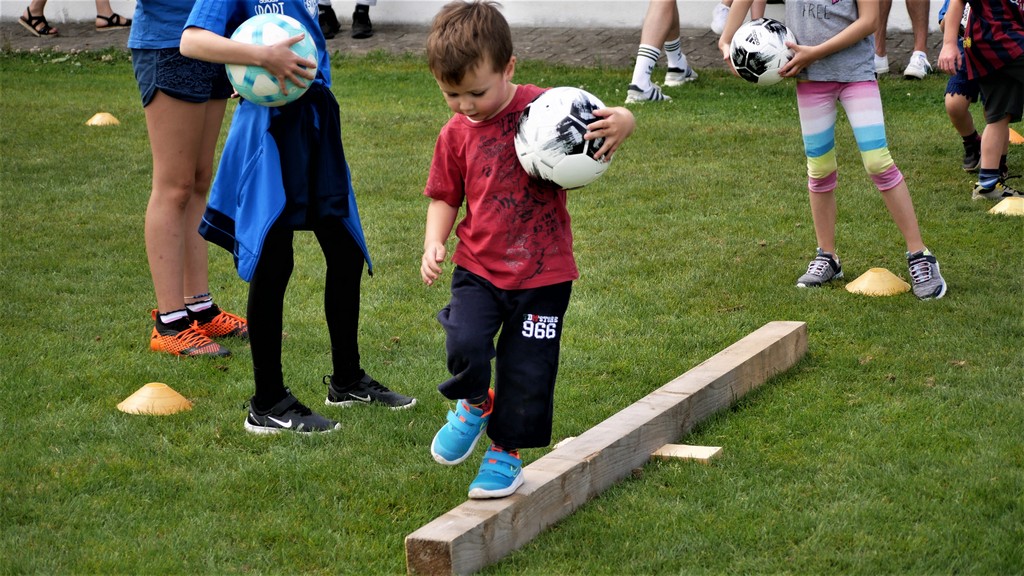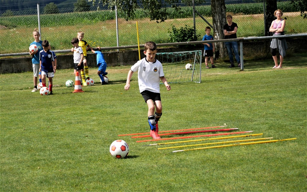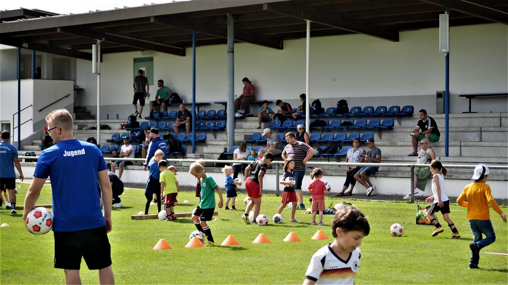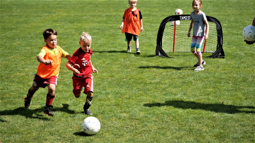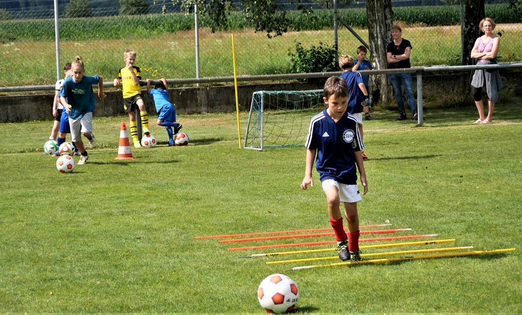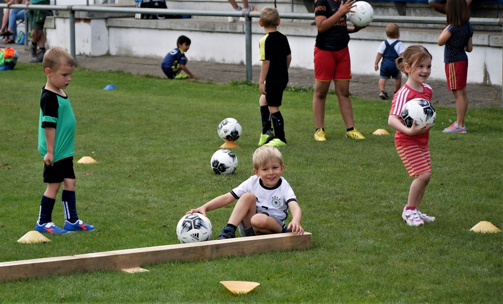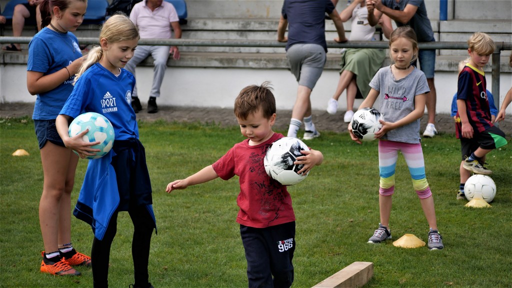 Gekommen waren nicht nur etwa dreißig schon aktive Mädchen und Jungen der Bambini- und der F-Jugend ( Altersklassen der 4- bis 10-jährigen Kinder) sondern dazu zehn Neulinge, die das Schnuppertraining gerne wahrgenommen hatten. Denen hatte es sichtlich Spaß bereitet, die vielen Übungsformen mit oder ohne die vielen bereitgestellten Bälle zu absolvieren. Die Übungsleiter waren auch bemüht, abwechslungsreiche Spiel-und Bewegungsformen anzubieten und fanden stets ermunternde Worte, wenn es mal beim Hüpfen, Balancieren, Umkurven, Slalomlauf, Ballführen oder Schießen noch nicht so perfekt klappte. Jedenfalls rechnet die Jugendabteilung damit, dass sich etliche der Kinder und auch weitere, die an diesem Vormittag verhindert waren, der Jugendabteilung anschließen werden.