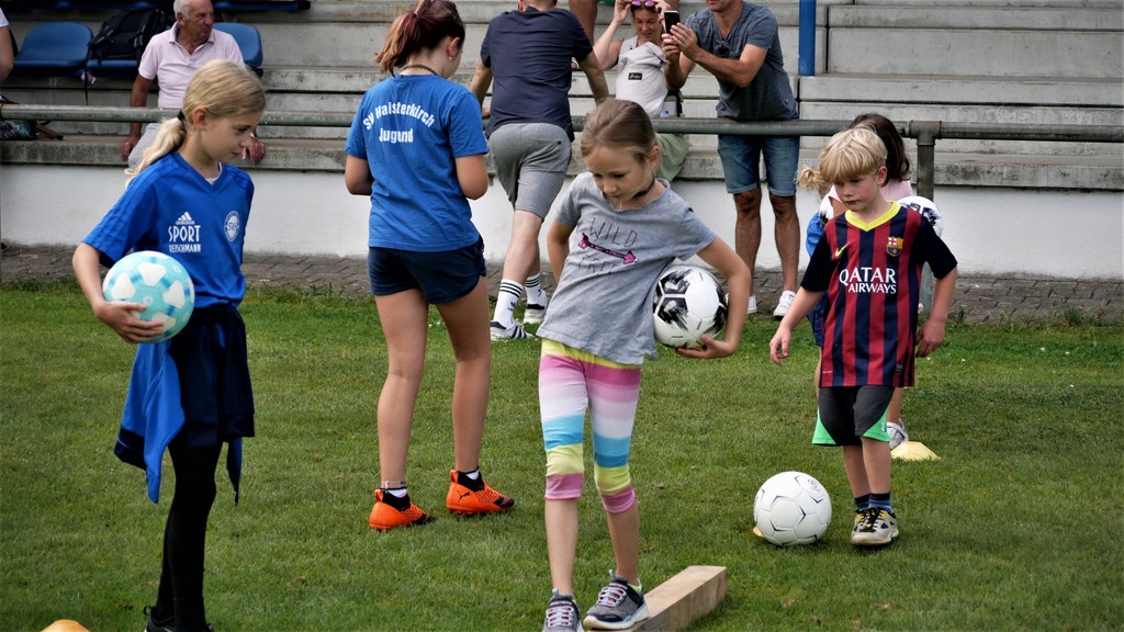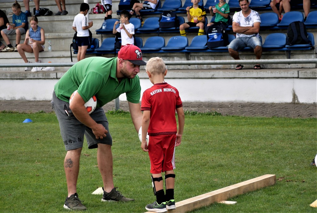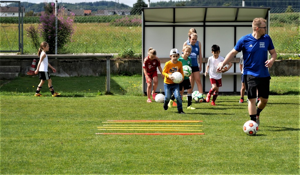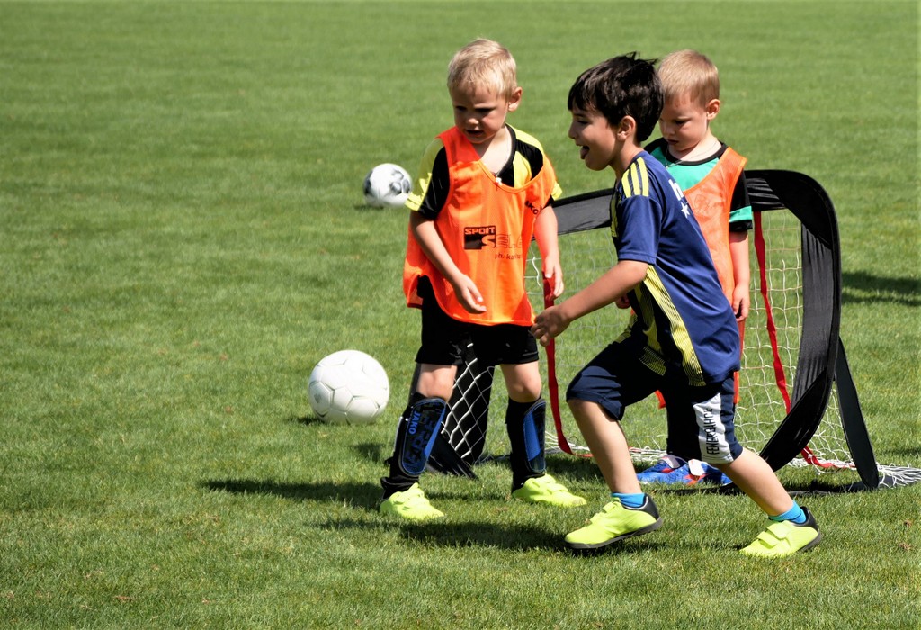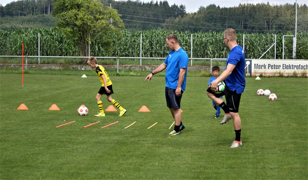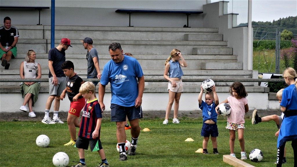 Gekommen waren nicht nur etwa dreißig schon aktive Mädchen und Jungen der Bambini- und der F-Jugend ( Altersklassen der 4- bis 10-jährigen Kinder) sondern dazu zehn Neulinge, die das Schnuppertraining gerne wahrgenommen hatten. Denen hatte es sichtlich Spaß bereitet, die vielen Übungsformen mit oder ohne die vielen bereitgestellten Bälle zu absolvieren. Die Übungsleiter waren auch bemüht, abwechslungsreiche Spiel-und Bewegungsformen anzubieten und fanden stets ermunternde Worte, wenn es mal beim Hüpfen, Balancieren, Umkurven, Slalomlauf, Ballführen oder Schießen noch nicht so perfekt klappte. Jedenfalls rechnet die Jugendabteilung damit, dass sich etliche der Kinder und auch weitere, die an diesem Vormittag verhindert waren, der Jugendabteilung anschließen werden.