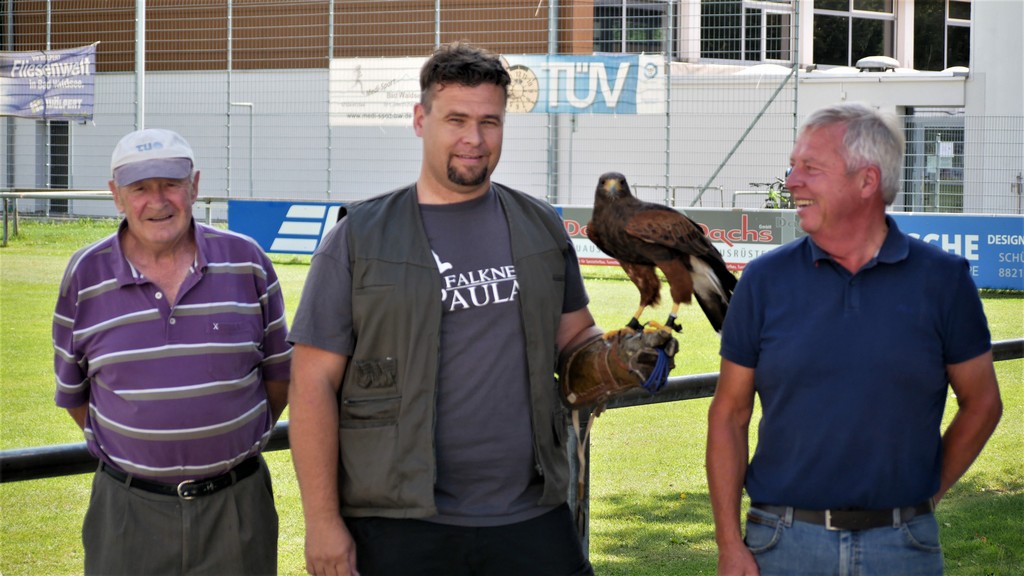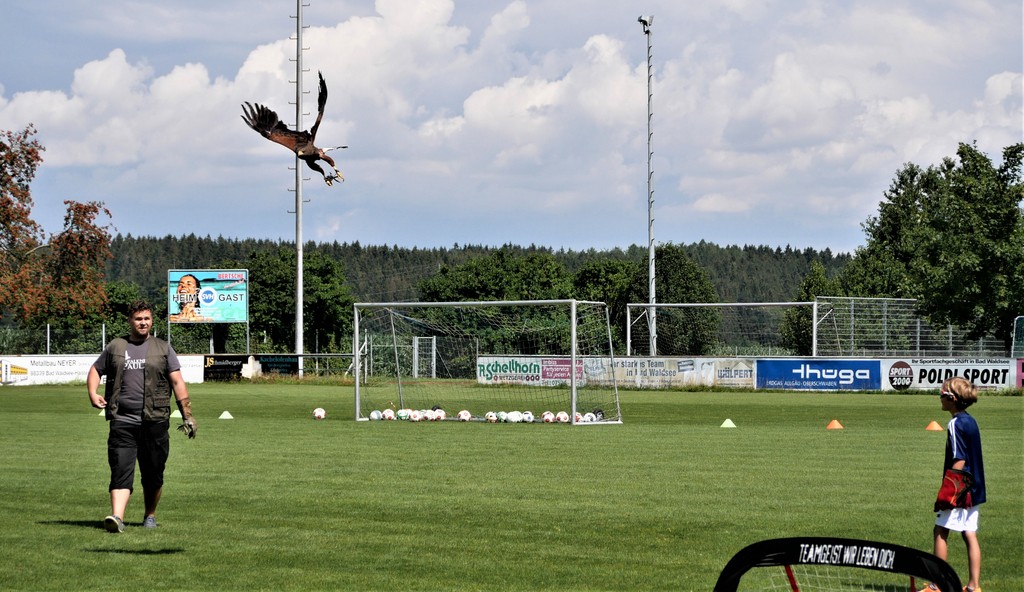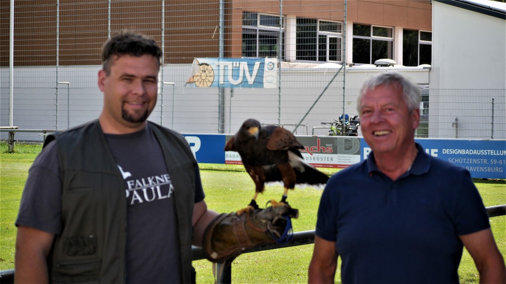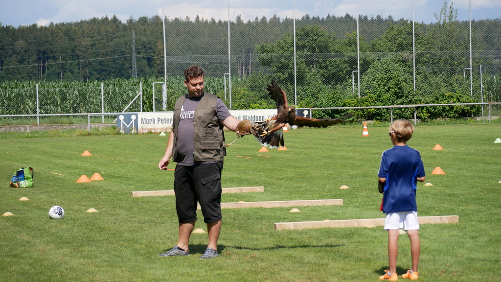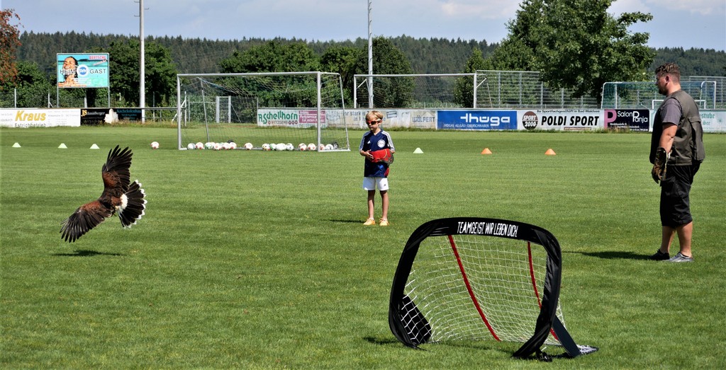 Als Belohnung gab es für die Schnuppernden Snacks und Getränke. Zudem wurde noch eine Überraschung geboten während einer Bewegungspause. Der Vater eines Nachwuchsspielers gewährte den Anwesenden einen Einblick in die Lebenswelt von Greifvögeln.Vor allem die Kinder, die sich rege zu Wort meldeten, verfolgten interessiert den Vorführungen des Falkners Daniel Paulat aus Haidgau. Seinen mitgebrachten Wüstenbussard ließ er aufs Stadiondach entschweben. Von dort stürzte sich dann „Hannah“, wie Daniel Paulat seinen 9-jährigen Bussard liebevoll nannte, auf die hochgeworfenen Fleischstücke. Es war für alle eine lehrreiche, naturkundliche Demonstration.
