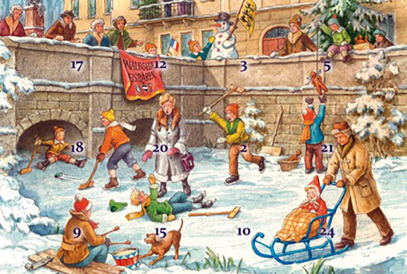 René Auer, der Waldseer Ali Mitgutsch, hat heuer eine Schlitten- und Eislaufpartie vor dem Waldseer Schloss gemalt – es wimmelt von kleinteiligen Szenen wie beim jüngst verstorbenen Meister dieses Genres.
