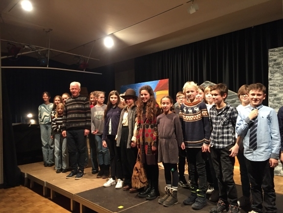 Als „rein aus dem Unterricht entstanden“ und „mit der Taschenlampe beleuchtet“ (unter vollem Einsatz von Mila Mahrt, 6b) kündigte der erfahrene Musiker das „Stückchen“ an, welches er selbst 45 Minuten lang am Klavier hinter dem Vorhang begleitete, um gleichzeitig das spielende Team zusammenzuhalten.