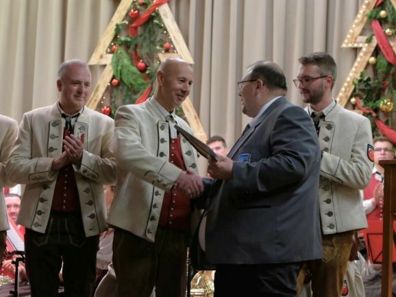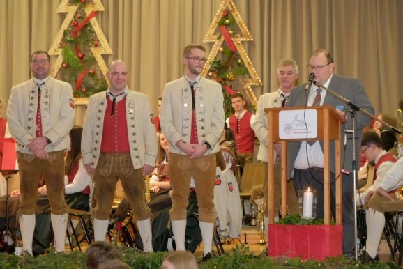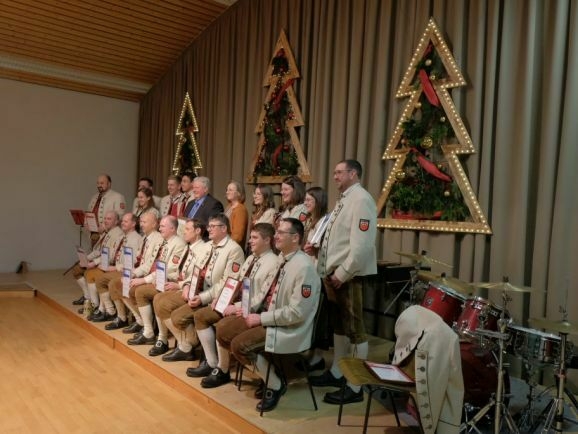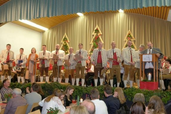 Für 30 Jahre aktive Tätigkeit wurde Tubist Roland Heine, der von 2009 bis 2013 dem Verein vorgestanden hatte, mit der BVBW Ehrennadel in Gold mit Urkunde ausgezeichnet. Dieselbe Ehre wurde Hornist Christian Tanner zuteil, der nebenbei auch noch als Notenwart zuverlässig dem Verein dient.