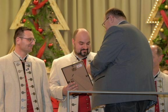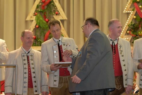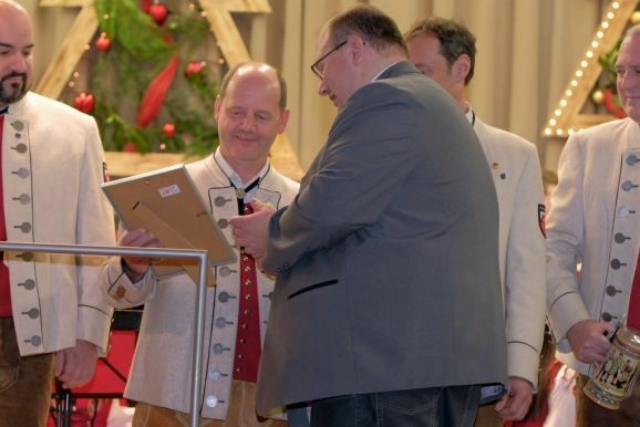 Der ehemalige erste Vorstand Frank Döbele (Flügelhorn) wurde für seine 30 jährige Musikantentätigkeit mit der die Ehrennadel in Gold mit Urkunde ebenso ausgezeichnet wie für seine 15 Jahre Vorstandstätigkeit (als Beisitzer seit 2009) mit der Förderermedaille in Silber mit Urkunde.