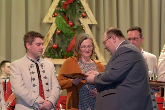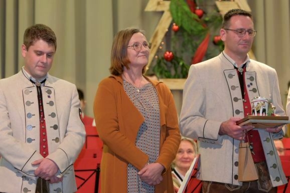 Trompeter Julian Kibler ist seit 10 Jahren engagierter Jugendleiter des Vereines und wurde dafür von Bitterwolf mit der BVBW Förderermedallie in Bronze mit Urkunde ausgezeichnet. Dietmar Kümmerle ist musikalisch am Tenorhorn tätig und seit 15 Jahren als Kassier einer der wichtigsten Männer im Verein. Dafür wurde er nun mit der BVBW Förderermedaille in Silber mit Urkunde geehrt. Monika Branz ist seit 15 Jahren als passive Beisitzerin im Vorstandsgremium aktiv. Als gelernte Köchin sorgt sie bei vielen Gelegenheiten für schmackhafte Gerichte, ist aber darüberhinaus als Kirchengemeinderätin auch Bindeglied zwischen Kirchengemeinde und Musikverein.