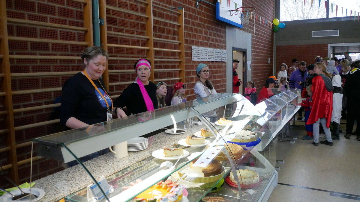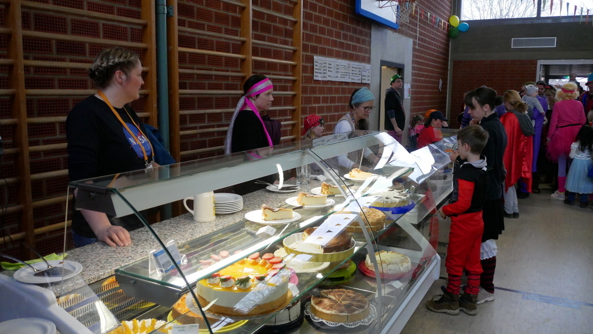 Die lange Theke mit einem von Eltern gespendeten, umfangreichen leckeren Torten- und Kuchen-angebot und später mit deftigem Vesperangebot war stets umlagert. Alles gab es zu familienfreundlichen Preisen.